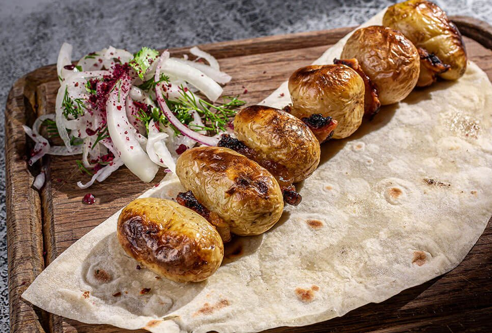 Картофель на углях целый с приправами и курдюком.